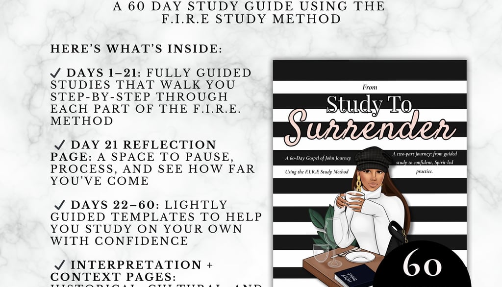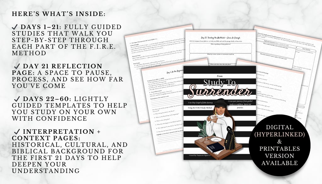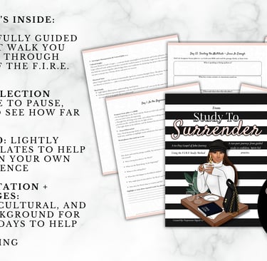 From Study to Surrender is a full 60-day Bible study journey through the Gospel of John—designed to help you study deeply, reflect honestly, and walk boldly in obedience.